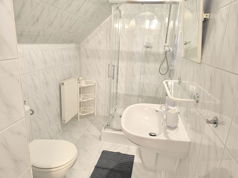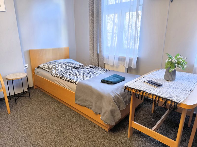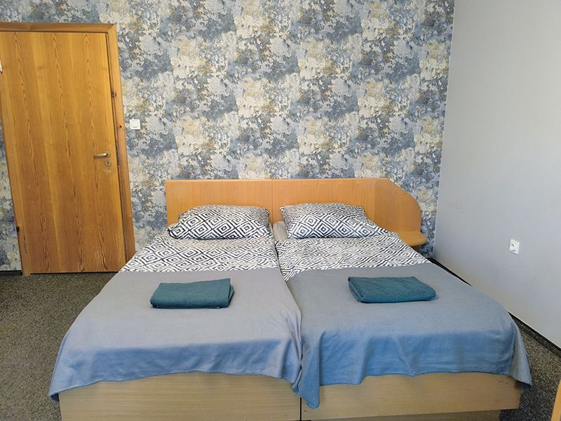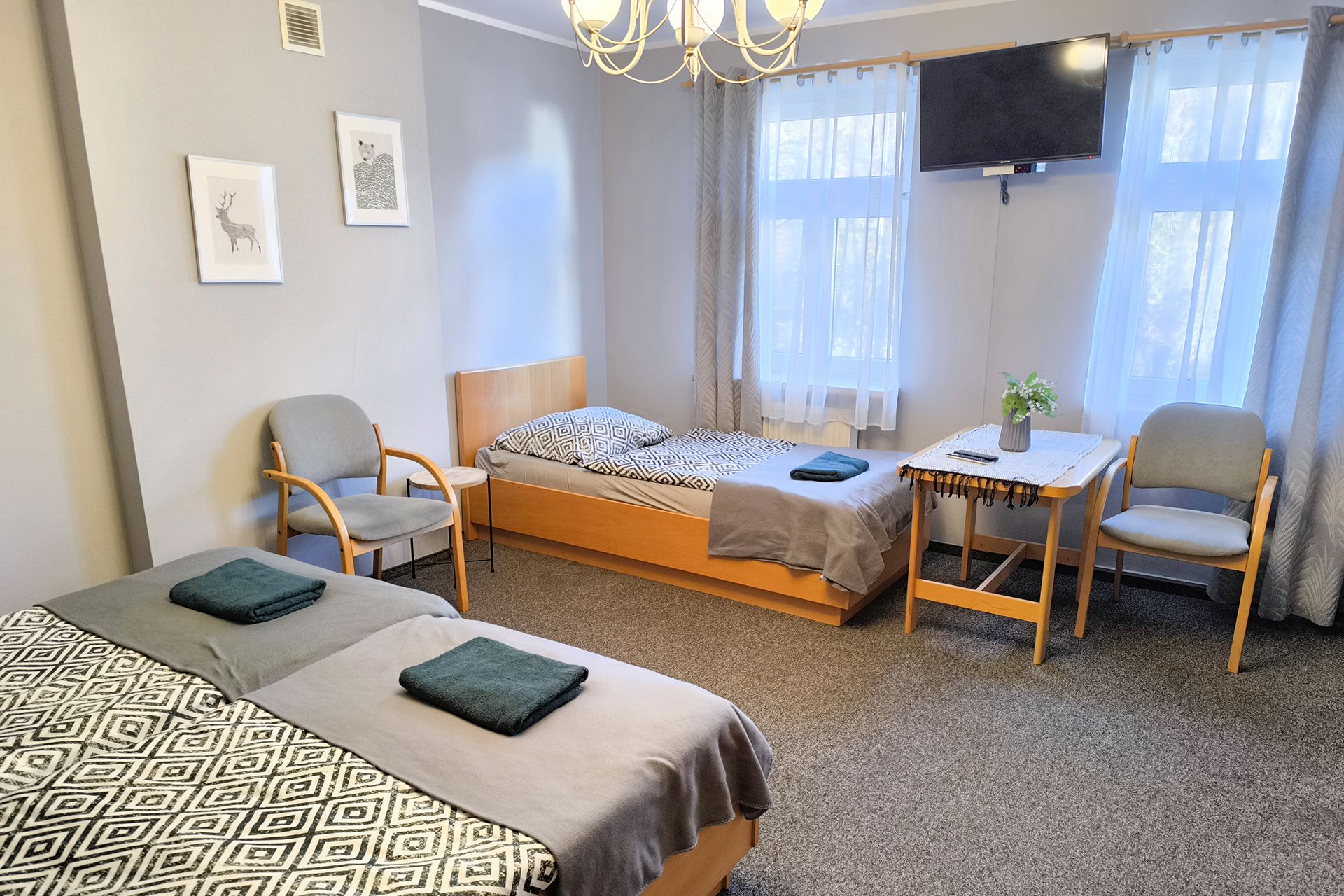 Pokój dla 3 lub 2 os. z łazienką wyposażoną w wc, kabinę prysznicową, mydło, ręcznik. W pokoju TV. Powierzchnia pokoju z łazienką ok 20 m kw. Pokój nie posiada balkonu. W pokoju jedno łóżko małżeńskie i dwa pojedyncze lub trzy pojedyncze. Na terenie obiektu WiFi zabezpieczone hasłem. Parking obok obiektu.